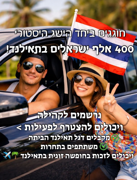 הקהילה הגדולה והפעילה ביותר של אוהבי תאילנד בישראל! כאן תמצאו הכל על תאילנד: עצות לטיולים, המלצות על מלונות ואטרקציות, דילים בלעדיים, חוויות של מטיילים, ומידע עדכני על מה שקורה במדינת החיוכים. הקהילה מאורגנת על ידי אוהבי תאילנד ותמיכת משרד התיירות התאילנדי.